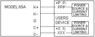 Las coneciones "K" en el convertidor son las salidas para el bucle. K+ es el colector del transistor y el K- es el emi-sor del transistor. En el modo PASIVO, el transistor esta flotando; el usuario tiene que suplir la corriente para el bu-cle. En el modo Activo el Modelo 65A suple un voltaje positivo (aproximadamente +12 Voltios) por una resistencia de 560 Ohms, ½ Vatio, al punto K+, colector, y la corriente esta disponible en el punto K-.