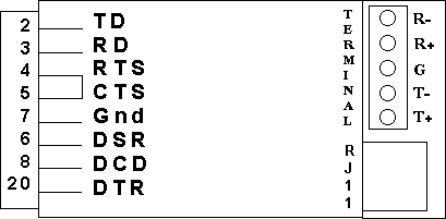 Note: The four wire line between modems must be two twisted pairs. On each modem, the wires marked T+ and T- must be members of the same twisted pair, R+ and R- members of the other.