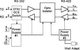 The RS-422 side is powered by a small, wall mounted trans-former that supplies 9 VAC @ 500 mA.