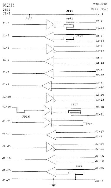 The phase of the signals associated with Pins 2, 3, 18, 21 and 25 are jumper selectable. There is a similarity between the RS-232 specification and the military specification MIL-STD-188C. The specifications differ in that the voltage range for the military specification is +/-6 V and the Model 62-1 / -2 drivers supply +/-10 V, although Telebyte receivers correctly decode inputs from military standard drivers. Secondly, MIL-STD-188C calls for wave shaping and the Model 62-1 / -2 has no wave shaping on the output signals. Finally, the specifications define the mark as a negative voltage whereas MIL-STD-188C define it as positive; jumpers have been provided on the data signals. To convert from RS-232 to MIL-STD-188C data signals, change jumper JP 12 and JP 14