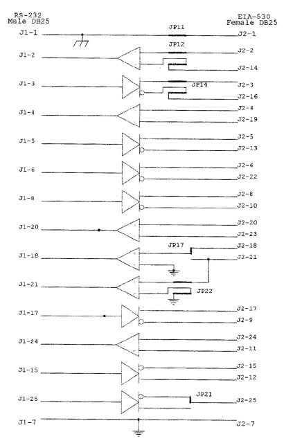 3.2.2 Data Signal Phasing for Model 62-1 The phasing of the control signals is different for the Model 62-1 than it is for the Model 62-2. The phase of the LL (J1 - Pin 18, J2 - Pin 18) and RL (J1 - Pin 21, J2 - Pin 21) signals for the Model 62-1 are affected by the shunts located at jumpers JP 16 and 17 on the main PC board and JP 23 on the upper board. The shunts allow user-selection of the phase of the signals on Pin 18 and 21 of the EIA-530 interface as well as selecting the source of those signals. There are two EIA-530 driving circuits involved with these signals. The normal configuration of the converter associates Pin 18 of each connector with each other as well as Pin 21 of each connector with each other. Refer to Appendix A, "Block Diagram for Model 62-1" or Appendix B, "Block Diagram for Model 62-2" to determine operation in other than the factory-set configurations. We do not recommended having a shunt located in JP 14 - Pin 4 and on JP 23 at the same time. This puts two drivers on J2 - Pin 21. The relative phasing of the TM signal (J1 - Pin 25 and J2 - Pin 25) is affected by