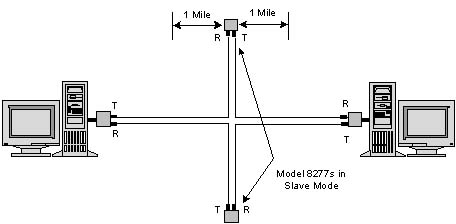 1.2 Optical InterfaceIn an optical point-to-point configuration, two Model 8277s are connected back to back to form a simple, high-speed, full-duplex optical link. In optical ring operation, two or more 8277s are cascaded in a ring. A ring consists of one master modem and two or more slaves (see Figure 2). The slaves pass received optical data and transmit data from their electrical interface to their optical transmitters. The master does not pass received optical data. Master/slave modes are