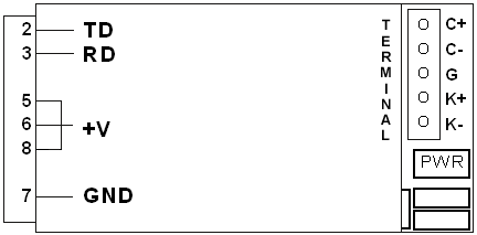 Las coneciones "C" en los convertidores representan la entrada al diodo de un acoplador óptico. La coneción C+ es el ánodo del diodo y el C- es el cátodo del diodo. En el modo "Half Duplex" el emisor del transistor (K- ) está conectado al ánodo del del diodo en el aislador óptico que tiene una resistencia de 33 Ohmios en serie con el cátodo del diodo.