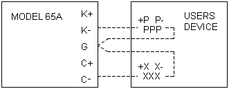 Las coneciones "K" en el convertidor son las salidas para el bucle. K+ es el colector del transistor y el K- es el emi-sor del transistor. En el modo PASIVO, el transistor esta flotando; el usuario tiene que suplir la corriente para el bu-cle. En el modo Activo el Modelo 65A suple un voltaje positivo (aproximadamente +12 Voltios) por una resistencia de 560 Ohms, ½ Vatio, al punto K+, colector, y la corriente esta disponible en el punto K-.